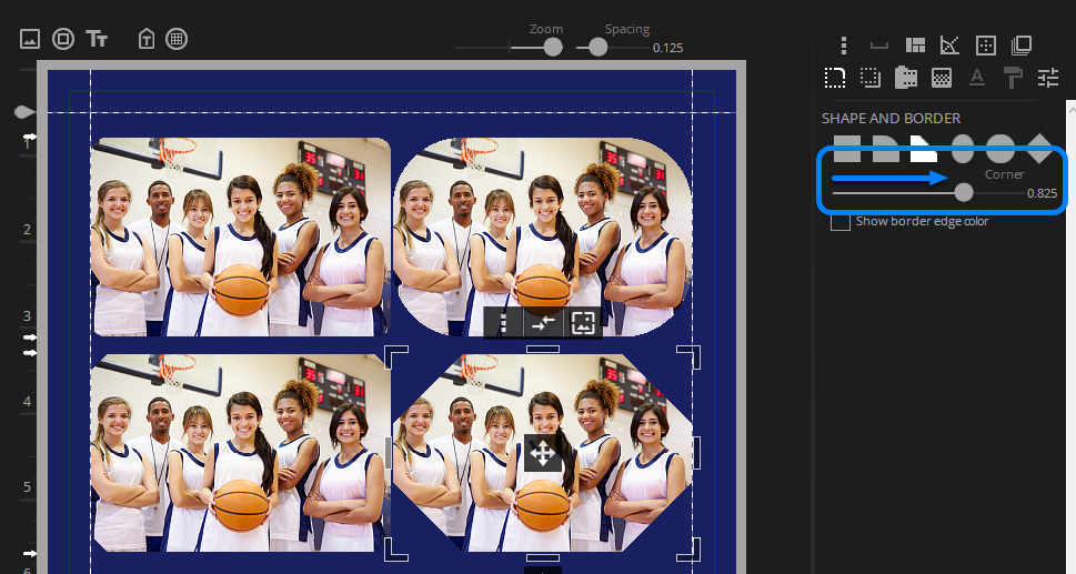 Rounded and Angled corner shapes can be adjusted to increase or decrease the corner size. When you select a border with an adjustable corner, a slider will appear under the shapes.