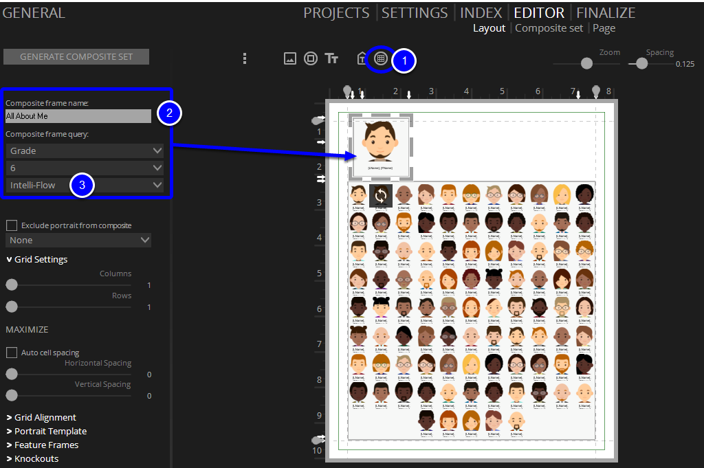 On the Editor's Layout tab, add a composite frame. Then set the frame query to show your main group. (eg: show every portrait within a particular grade or team).