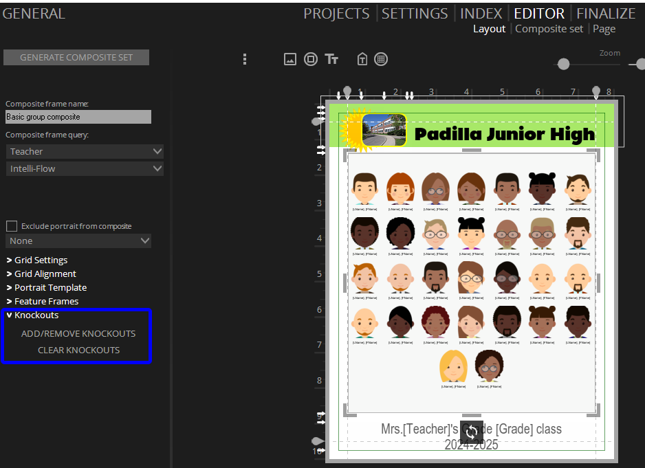 To reset the composite frame back to a standard grid, click on the composite frame, reopen Knockouts, then click on Clear Knockouts.